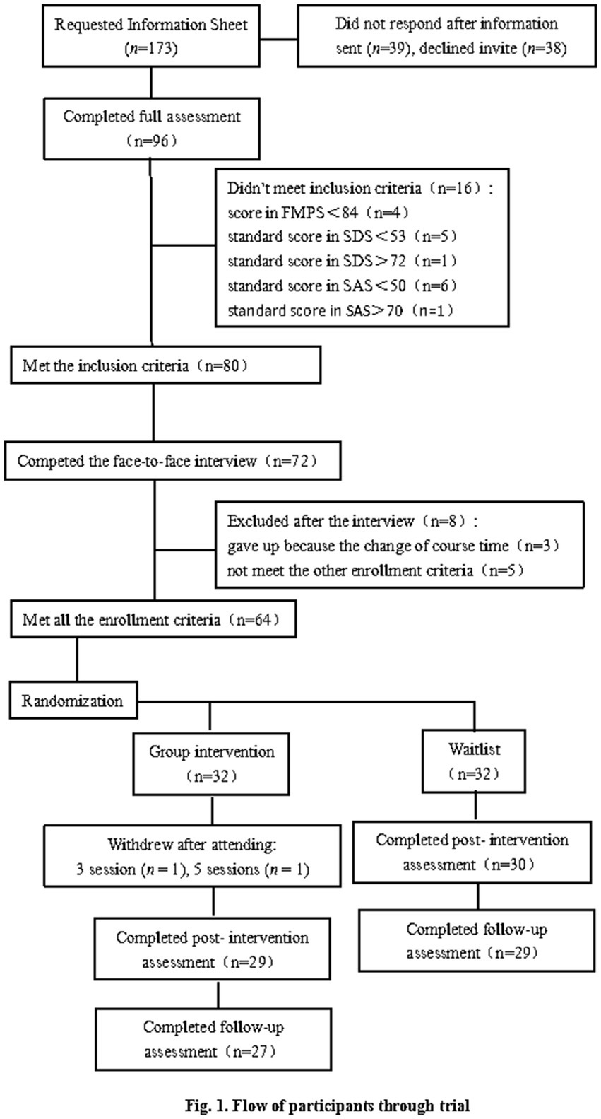 Volunteers were recruited through advertisements on the public course of Mental Health Education for university students and public accounts of mental health centers on WeChat. The inclusion criteria of participants were as follows: (a) being an undergraduate or postgraduate student; (b) willingness to participate in group intervention; (c) 84 or above total score in the FMPS (an individual with a score above 84 was defined as high perfectionism tendency by Frost); (d) 53 ≤ standard score in the SDS ≤ 72, or 50 ≤ standard score in the SAS ≤ 70; and (e) commitment to participate in group intervention to the end. Exclusion criteria were (a) hallucinations or other acute episodes of psychosis; (b) immediate risk of suicide, self-injury or injury to others; (c) any current psychological treatment for psychiatric problems; and (d) any change in psychotropic medication 3 months prior to entering treatment.