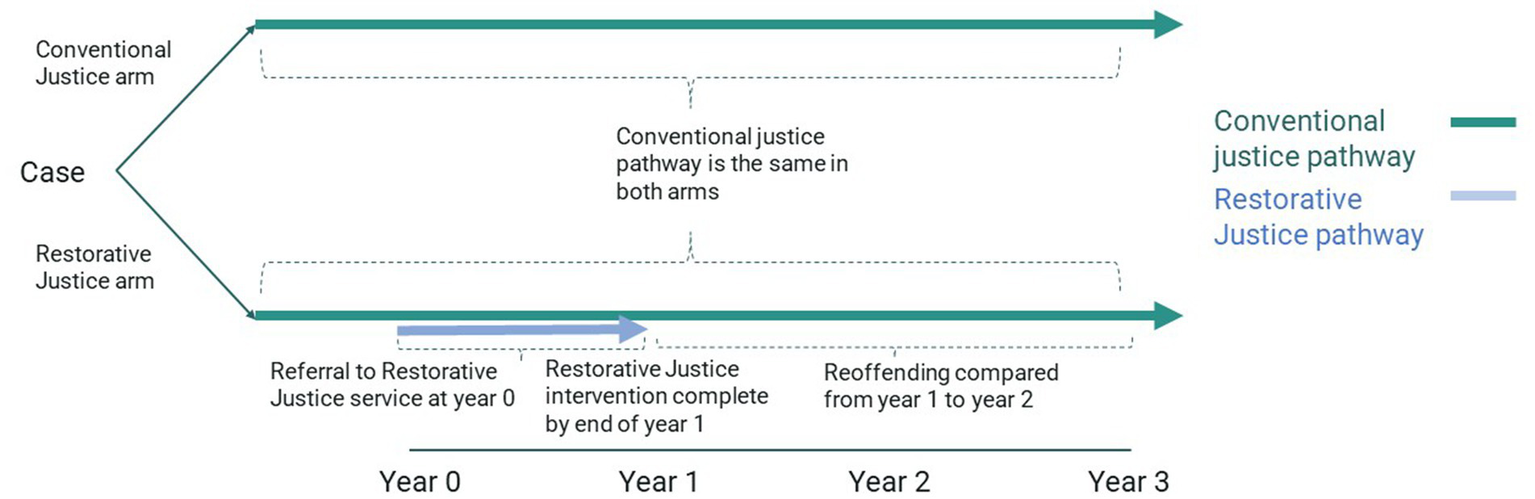 Each case in the restorative justice arm entered the restorative justice pathway in the first year. The pathway had a number of stages: