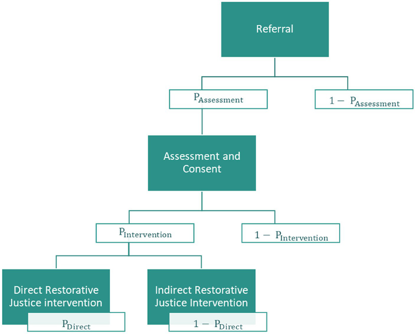 Figure 1 illustrates the model structure. The model was separated into one-year periods. Each victim-offender grouping (henceforth termed a ‘case’) entered either the conventional justice arm or the restorative justice arm (which consists of the conventional justice pathway, supplemented by a restorative justice intervention). It had a two-year time horizon in the base case. The delivery of a restorative justice intervention was modeled over a one-year period, with the impact of the intervention modeled over a subsequent one-year period. Extended time horizons were tested as part of sensitivity analysis.