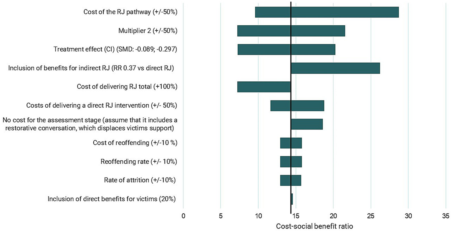 In the model, 8% of referrals to restorative justice resulted in direct restorative justice interventions and 19% resulted in indirect Restorative justice interventions. The modeled cost of the restorative justice pathway per direct intervention was £3,394. The base case estimate for the social benefit–cost ratio of restorative justice was £14 per £1 invested, with a direct return to the criminal justice system of £4 as a result of substantial reductions in reoffending. Scenario analysis suggested a plausible range of £7 to £20 social benefit per £1 invested. Hypothetically, increasing the proportion of eligible cases referred for a restorative justice intervention from 15 to 40% could be associated with an increase in investment of £5 m, and benefits to the criminal justice system totaling £22 m, implying a net saving of £17 m.