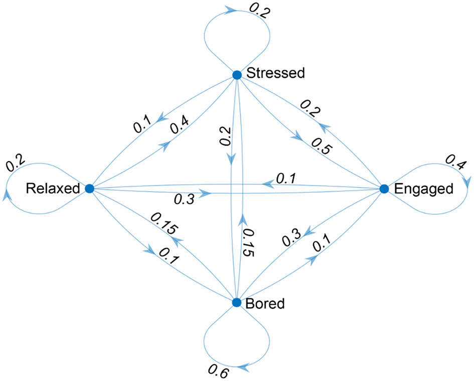 To graphically represent the affective states and the transitions between them, it is possible to adopt a directed graph, in which each state is represented by a node, and the transitions between states are represented by directed edges. This graph can be used to visualize the structure of the Markov chain and the relationships between the states (Figure 1).