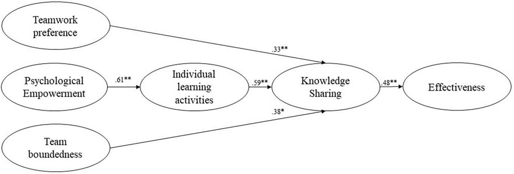 In Table 1, the bivariate correlations among individual learning activities and knowledge sharing, teamwork preference, team boundedness, psychological empowerment, and team effectiveness are listed. Individual learning activities were significantly related to knowledge sharing (r = 0.42, p < 0.001). Psychological empowerment and individual learning activities were also significantly related (r = 0.46, p < 0.001). A relationship exists between team boundedness and teamwork preference (r = 0.27, p < 0.001). Effectiveness moderately correlates with knowledge sharing (r = 0.33, p < 0.001). Based on these results, we specified the structural equation model.
