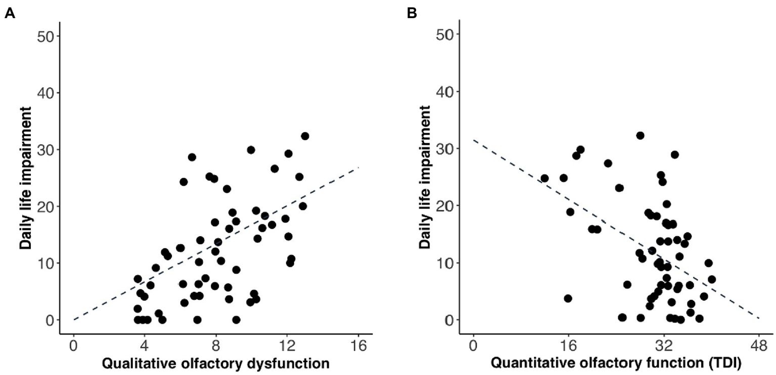 Next, we wanted to know whether there was a link between degree of impairment and the individuals’ rated quality of life. Using Spearman’s rank correlation, we found that daily life impairment was positively correlated with the degree of qualitative olfactory dysfunction (r = 0.57, p < 0.001; Figure 2A). Similarly, a correlation was found between daily life impairment and quantitative olfactory function (r = −0.38, p < 0.005; Figure 2B).