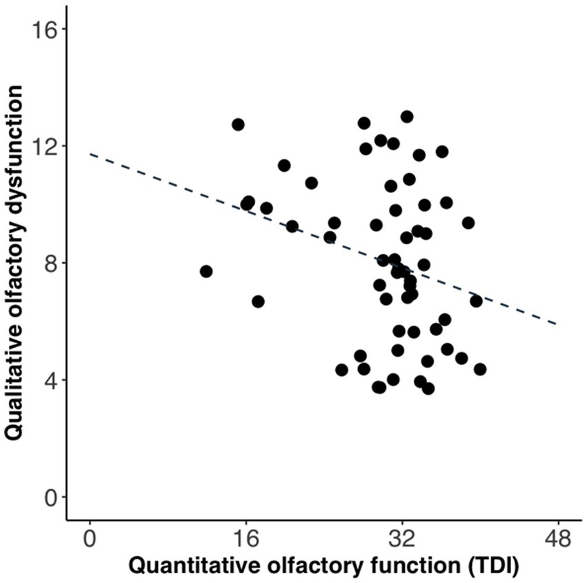 Relationship between qualitative olfactory dysfunction and quantitative olfactory function. Each data point represents one participant. Regression line is indicated by the intersected line. Scores are slightly jittered for visibility.