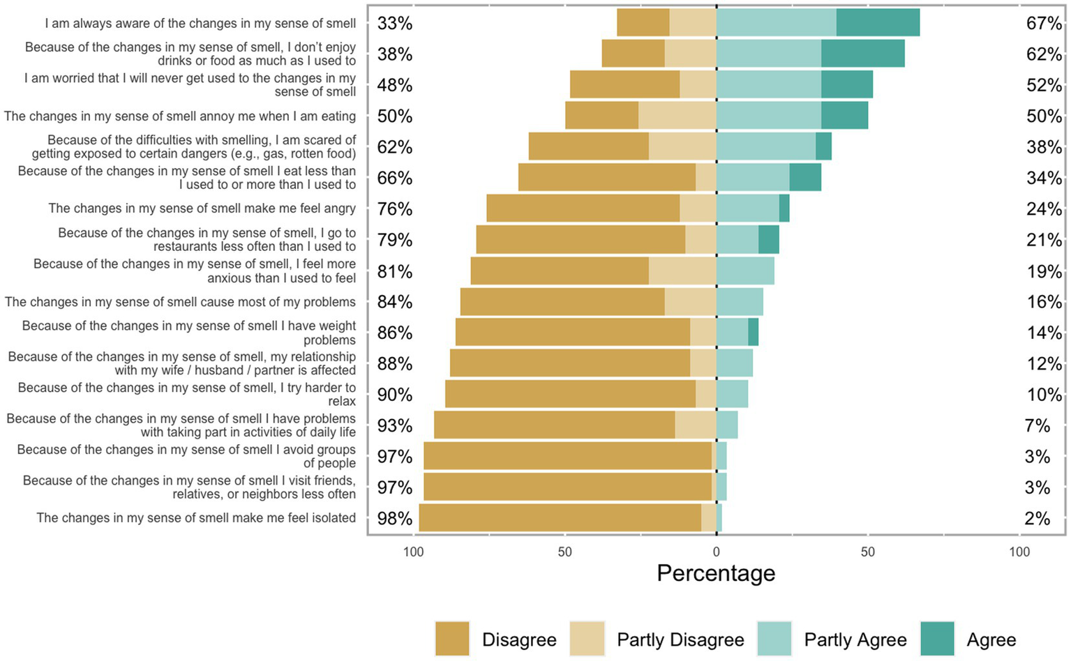 Participants with large quantitative olfactory dysfunction experienced a greater reduction in their quality of life. Moreover, our participants had a high prevalence of qualitative olfactory dysfunction (81%) with a significant correlation between qualitative olfactory dysfunction and daily life impairment. Strong drivers of low quality of life assessments were lack of enjoyment of food as well as worries related to coping with long-term dysfunctions.