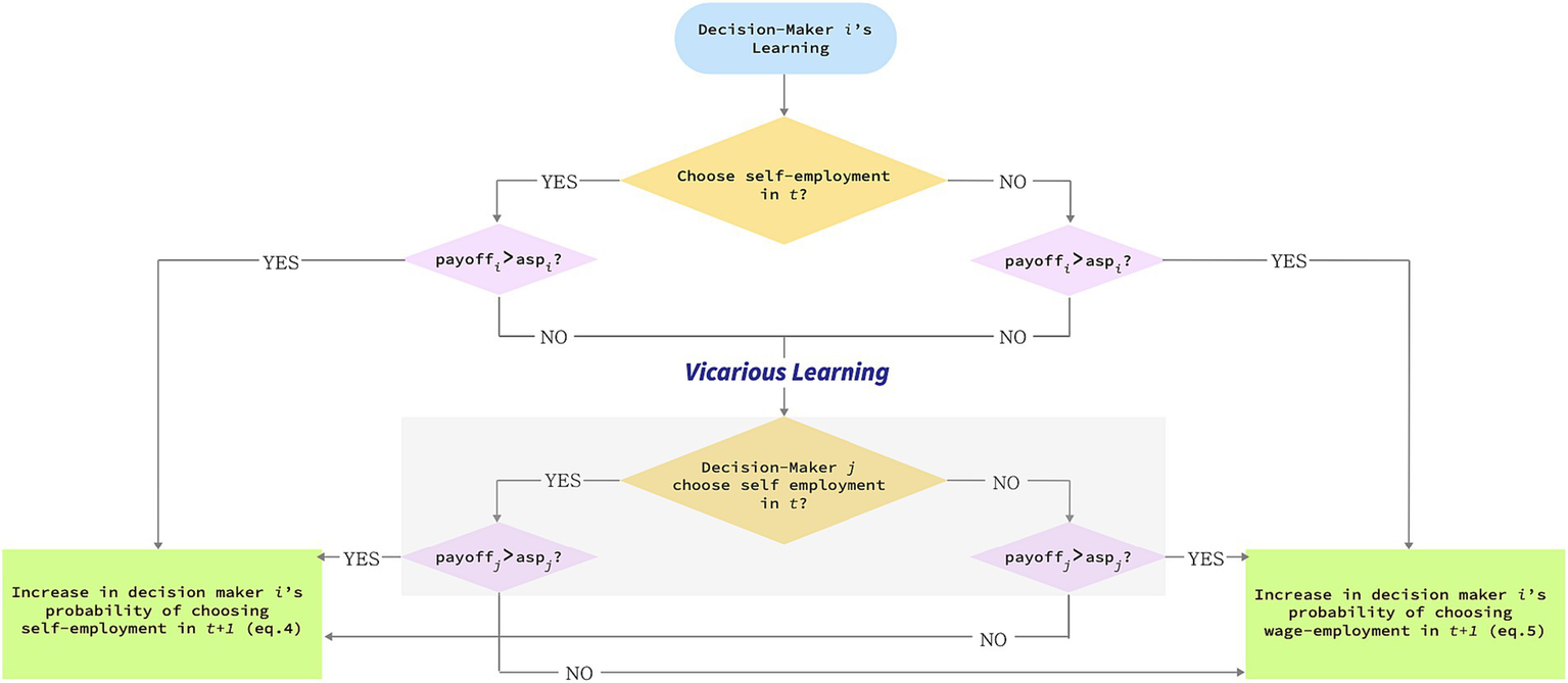 We build on existing models of adaptive learning to formalize the choice between a risky and non-risky alternative as the result of decision makers learning experientially and vicariously (Denrell and March, 2001; Burgos, 2002; Oyarzun and Sarin, 2013). Hereafter, in accordance with us using serial entrepreneurship to illustrate our conceptualization, we use self- and wage-employment to denote risky and non-risky options, respectively. The basic model on which we build is Denrell and March (2001)’s experiential learning model. It assumes a single decision maker who chooses between a risky alternative and a non-risky one. In every period, the decision maker receives performance feedback. This feedback shapes their choice for the next period. We modify this structure to include multiple decision makers that engage in both experiential learning and vicarious learning as they select into the risky alternative (self-employment) versus the non-risky alternative (wage-employment). Our model consists of four main components: the choice between a risky- and non-risky option, payoff outcome, aspiration level, and the experiential and vicarious learning processes.
