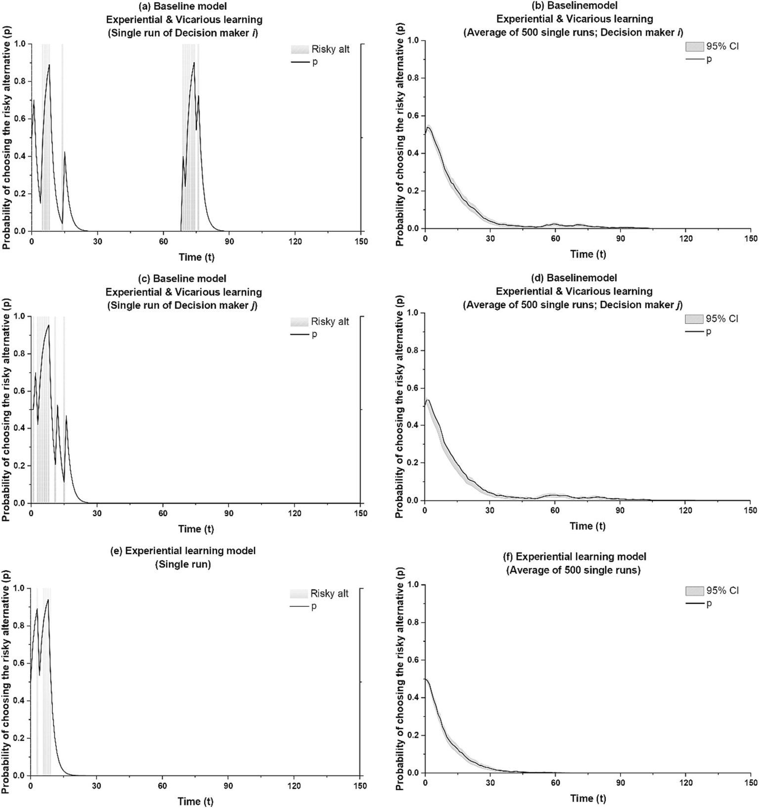Figures 2B,D show averaged result of 500 independent simulation runs for decision maker i and j, respectively. Intermittent risk taking is less pronounced in this averaged presentation but notable as a small uptick in p after t = 50. Of course, these averaged results understate the importance of recurring risk taking. Consider that only 50% of decision makers initially engage in the risky alternative, thereby setting the necessary stage for the itch to strike again at a later point. Also consider that not every initial entrepreneur re-engages in self-employment after settling into wage-employment, and that for those for whom the itch strikes, it strikes at different times. Ultimately, out of 500 independent simulation runs, risk taking recurs in 60 and 62 runs for decision maker i and j, respectively.