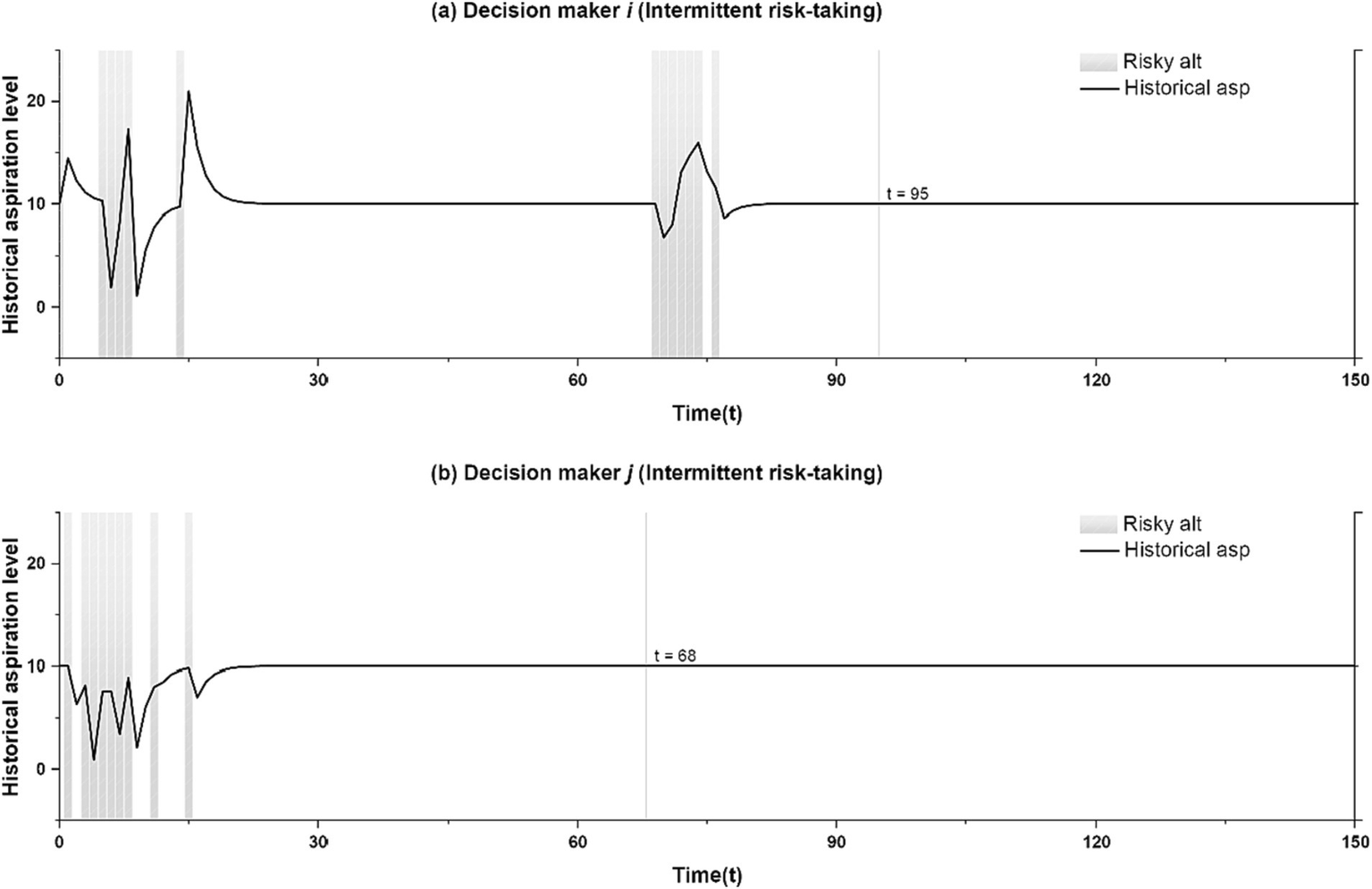 (a) and (b) illustrate intermittent risk-taking with historical and mixed aspiration, respectively.