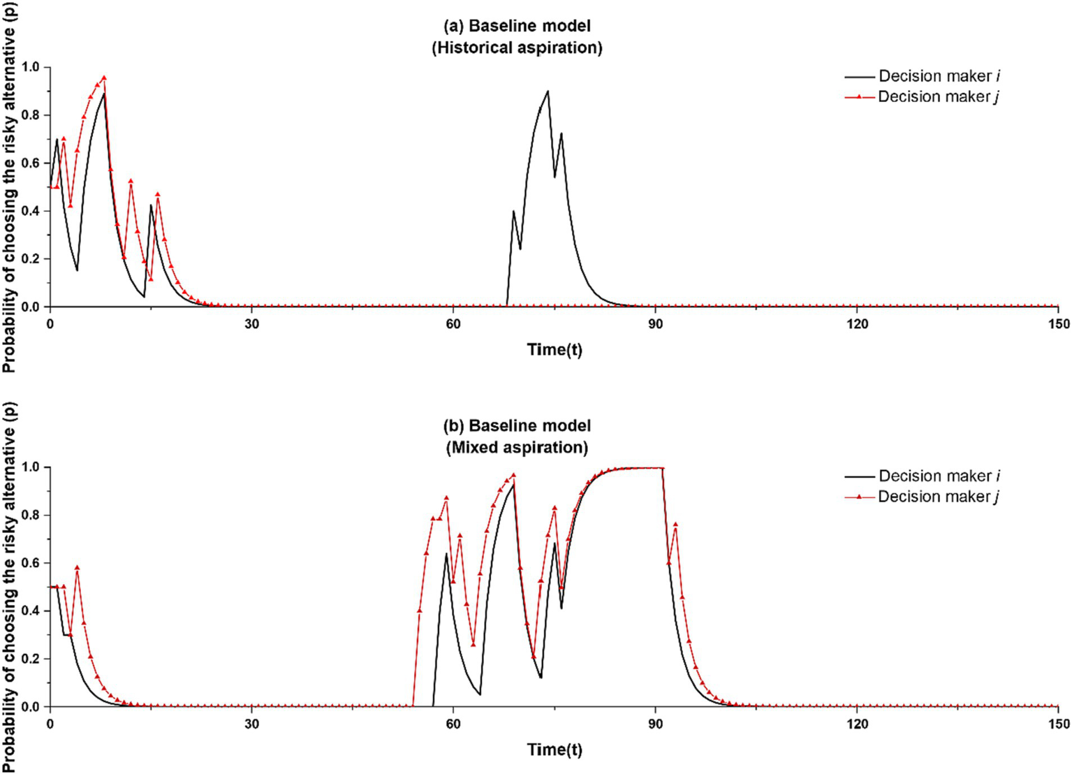 Figure 4 illustrates these results. Similar to Figures 2a–c, it shows individual simulation runs. Yet different to Figures 2a–c, it shows the probability of the two decision makers selecting into self-employment across time. Figure 4a shows a run from our baseline model with historical aspiration levels, with risk taking recurring to only one of the decision makers (in this case, decision maker i). Figure 4b shows a run from a model with mixed aspiration levels. Here, the pattern of the itch striking both decision makers in the same run is representative of 44% of all runs in which the itch strikes.