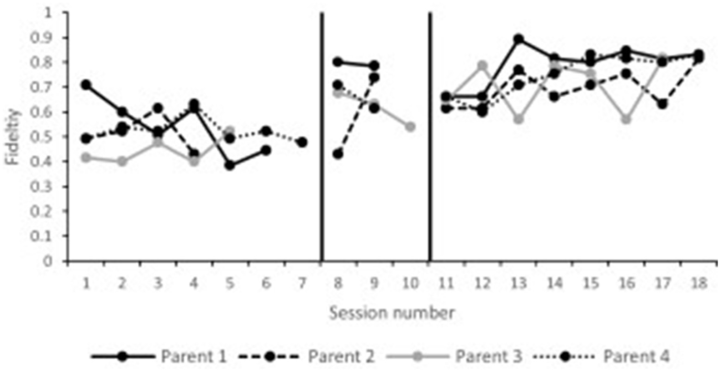 Consistent with standard practice in the field (e.g., Stone et al., 2021) and our previous work (e.g., Vismara et al., 2019), video coding was used to measure parent implementation of intervention; 13 intervention skills were rated based on scores of 1 (i.e., no competence) to 5 (i.e., high competence; described in Vismara et al., 2016) with scores of 4 or higher considered fidelity.