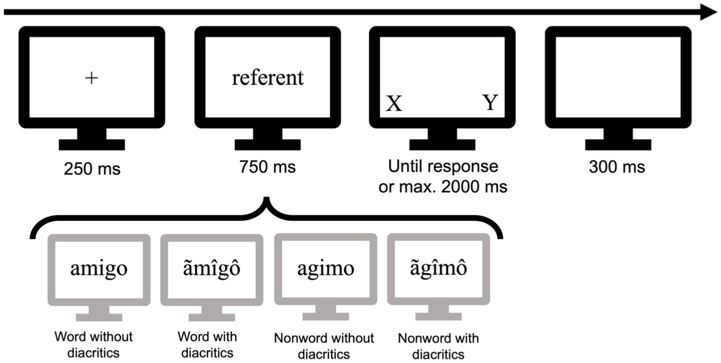In the present experiment, we chose a letter detection task to have a comparable setup for words and nonwords. This is a task that requires the same responses to words and nonwords, while being heavily influenced by top-down lexical effects. For instance, many experiments have shown that it is easier to recognize letters when embedded in words than in nonwords (i.e., a word superiority effect; see also Reicher, 1969; Wheeler, 1970; McClelland, 1976; Prinzmetal, 1992; Grainger et al., 2003; Casaponsa and Duñabeitia, 2016; see Cattell, 1886, for the first demonstration). In the task, we presented each item briefly either intact (without diacritics) or with extra non-existent diacritical marks in the target language (Spanish) [e.g., words: amigo (friend) vs. ãmîgô; nonwords: agimo vs. ãgîmô].