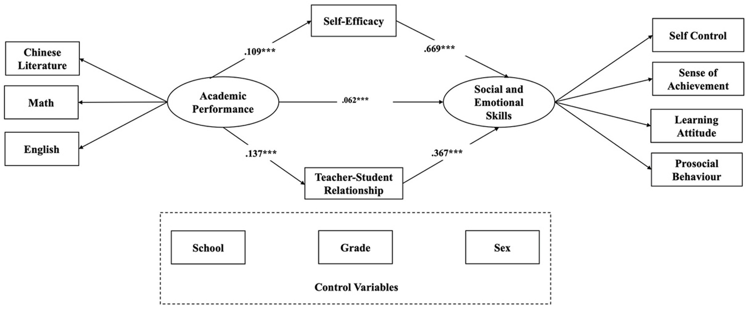 This research examined the relationships between students’ academic performance and their social and emotional skills in China, as well as the mediation pathways from the perspective of connectedness and social cognitive theory. A sample of 5,703 fourth to sixth graders from less affluent areas was investigated in a large-scale survey. The results indicated that students’ academic performance had salient positive connections with their socio-emotional skills. Structural equation modeling results revealed that both students’ perception of themselves (self-efficacy) and their relation with key persons (teacher-student relationship) played mediated roles in the association between academic achievement and social and emotional skills with the indirect path accounting for 66.66% of the total effect. This study highlights the important role of socioemotional skills in academic performance and suggests the need for further research to develop effective strategies and interventions for socioemotional development in Chinese students.