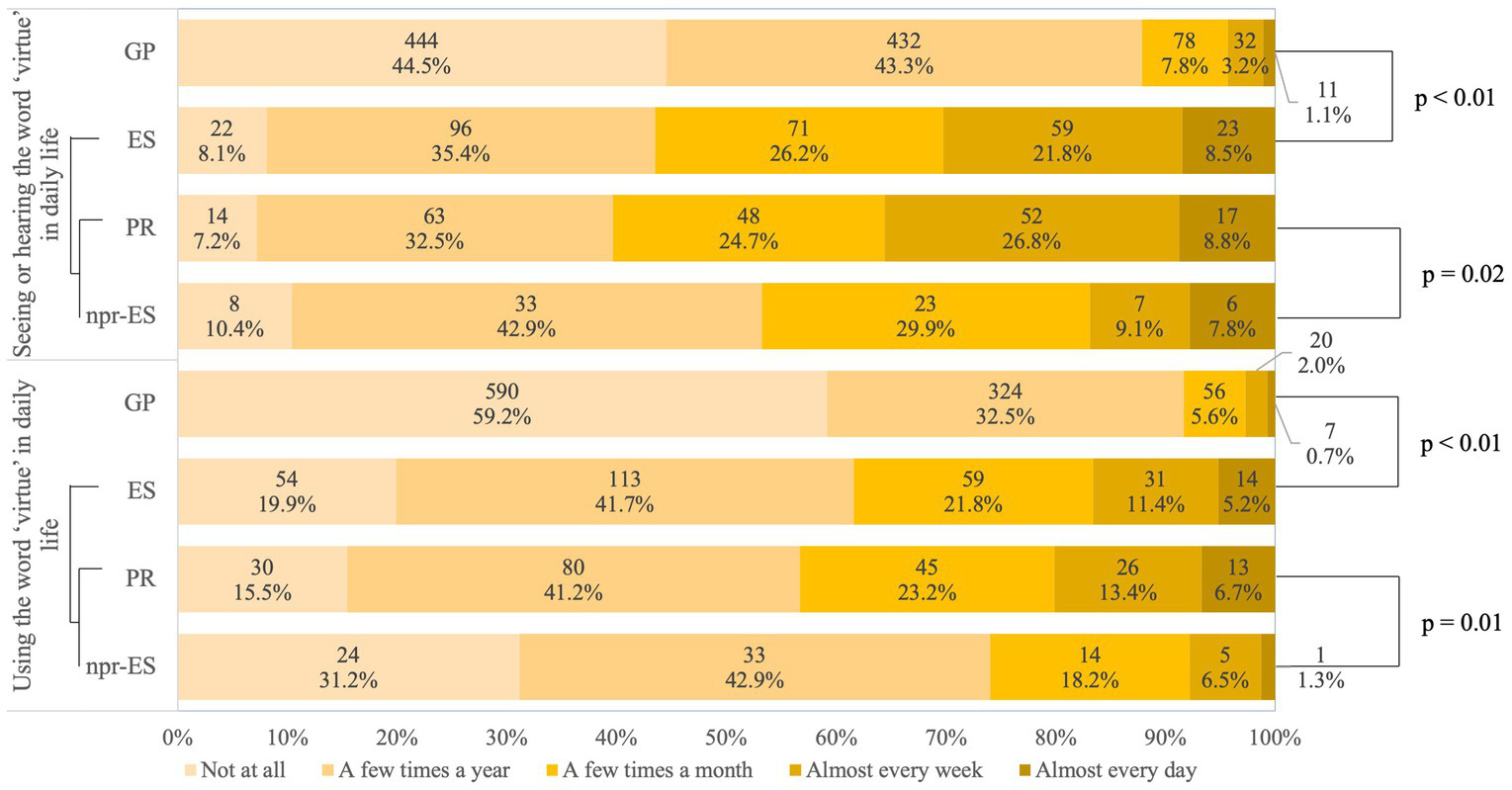 On familiarity with the notion of virtue: To what extent is the word ‘virtue’, which philosophers have advocated reviving, familiar to the GP? To what extent does the frequency with which the word is seen, heard, or used by the GP differ from that of ESs? (Answered through Result 3.1 and Discussion 4.1.)