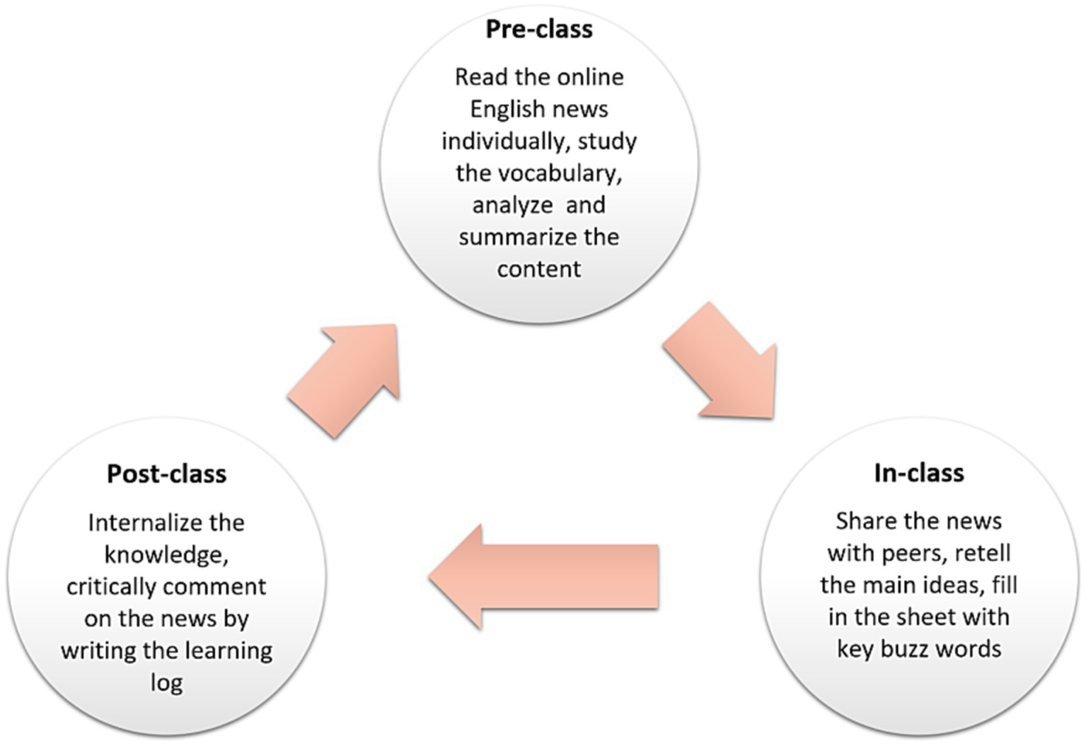 Students engaged in individual feedback, internalized the information, practiced critical thinking, and summarized the news. After that, the students listed brand-new expressions and vocabulary from these news stories, looked them up, and wrote definitions or explanations for them. They were ultimately required to write a learning log with remarks regarding the news. The cycle of this closed-loop method of instruction lasted 16 weeks (see Figure 1).