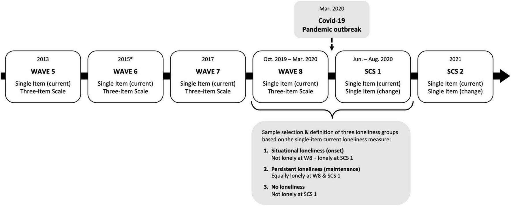 Timeline with overview of time points, available loneliness measures, and definition of loneliness groups used in the study. Three assessments of loneliness are available: 1. A single-item question asking about current loneliness, 2. A three item loneliness rating scale, 3. A single-item retrospective change question. Loneliness groupings were derived from the single-item current loneliness because it was asked at every wave and the SCSs. *Wave 6 data collection in Netherlands ended in 2016.