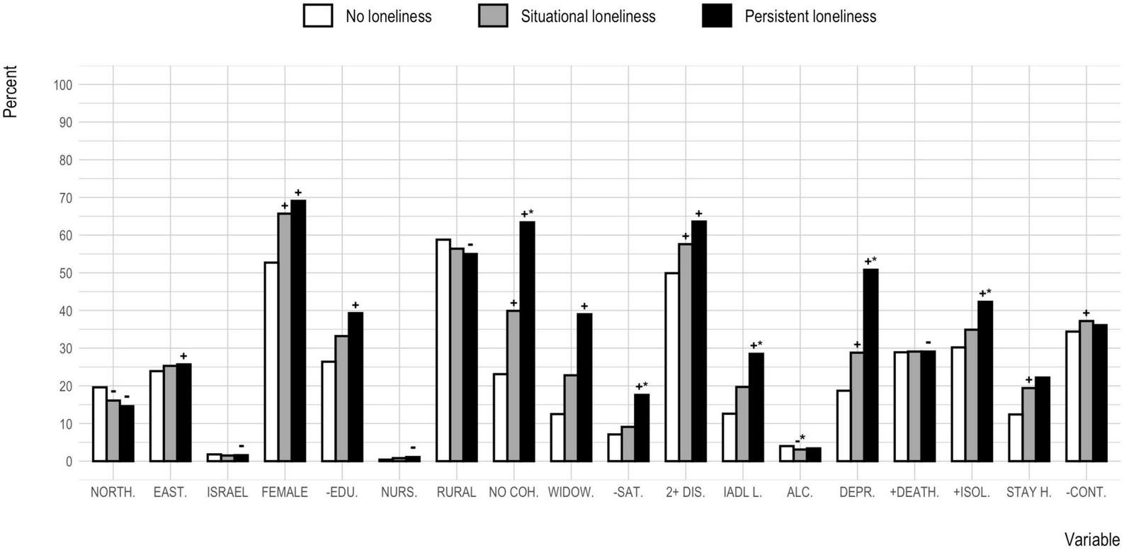 Loneliness was measured using a single item asking participants to rate the general frequency with which they experienced feelings of loneliness on a three-point scale (often / some of the time / hardly ever or never), and defined as reporting feeling lonely at least some of the time. Based on this dichotomous loneliness measure, three groups were defined based on loneliness levels before (Wave 8) and during the pandemic (in the SCS): situational loneliness, persistent loneliness, and no loneliness. Situational loneliness (onset) was defined as no loneliness before the pandemic (in Wave 8), and loneliness during the pandemic (in the SCS). Note, due to the lack of a follow-up measure, we refer to this as situational rather than transient loneliness. Persistent loneliness (maintenance) was defined as identical loneliness ratings before and during the pandemic. Due to the relatively short time in between the measures, this is referred to as persistent rather than chronic loneliness. The third group did not report feeling lonely during the pandemic. Groups defined using the single-item measure were validated using scores on the Three-Item Loneliness Scale (Hughes et al., 2004), a short version of the Revised UCLA Loneliness Scale (Russell et al., 1980) that was used in SHARE waves 5–8. Both measures have been shown to be reliable and valid measures of loneliness and show good convergent validity (Mund et al., 2022).