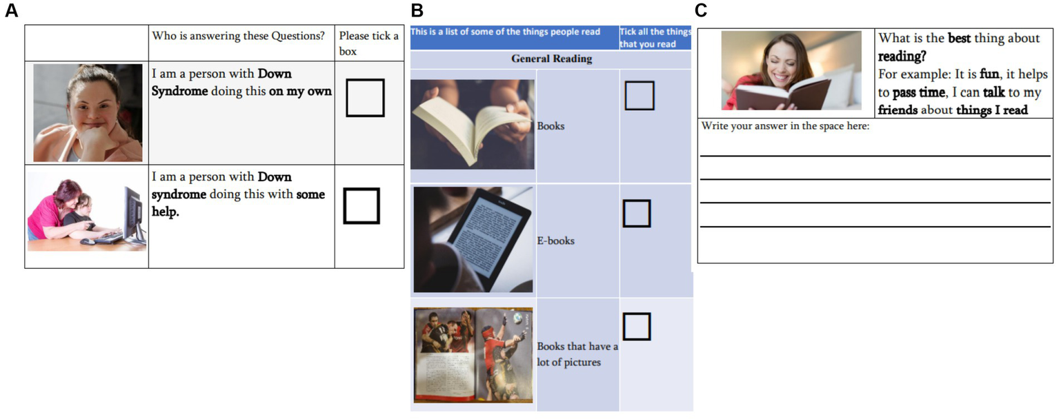 All anonymized results were shared with the researchers who compiled the lists into one draft checklist and created the first version of the Meaningful Reading Measure (MRM). Guidelines on easy-read materials from Nomura et al. (2010) and the UK Department of Health (2010) were considered in the design of all aspects of the tool. Questions were concise with limited use of abstract language and picture supports were provided to support the meaning of each question. The layout contained wide margins with consistent spacing. Most text was placed inside a defined space in a clear non-serif font and a type-size of 18 pt. or greater. In addition, key words were boldened for emphasis (see Figure 1).