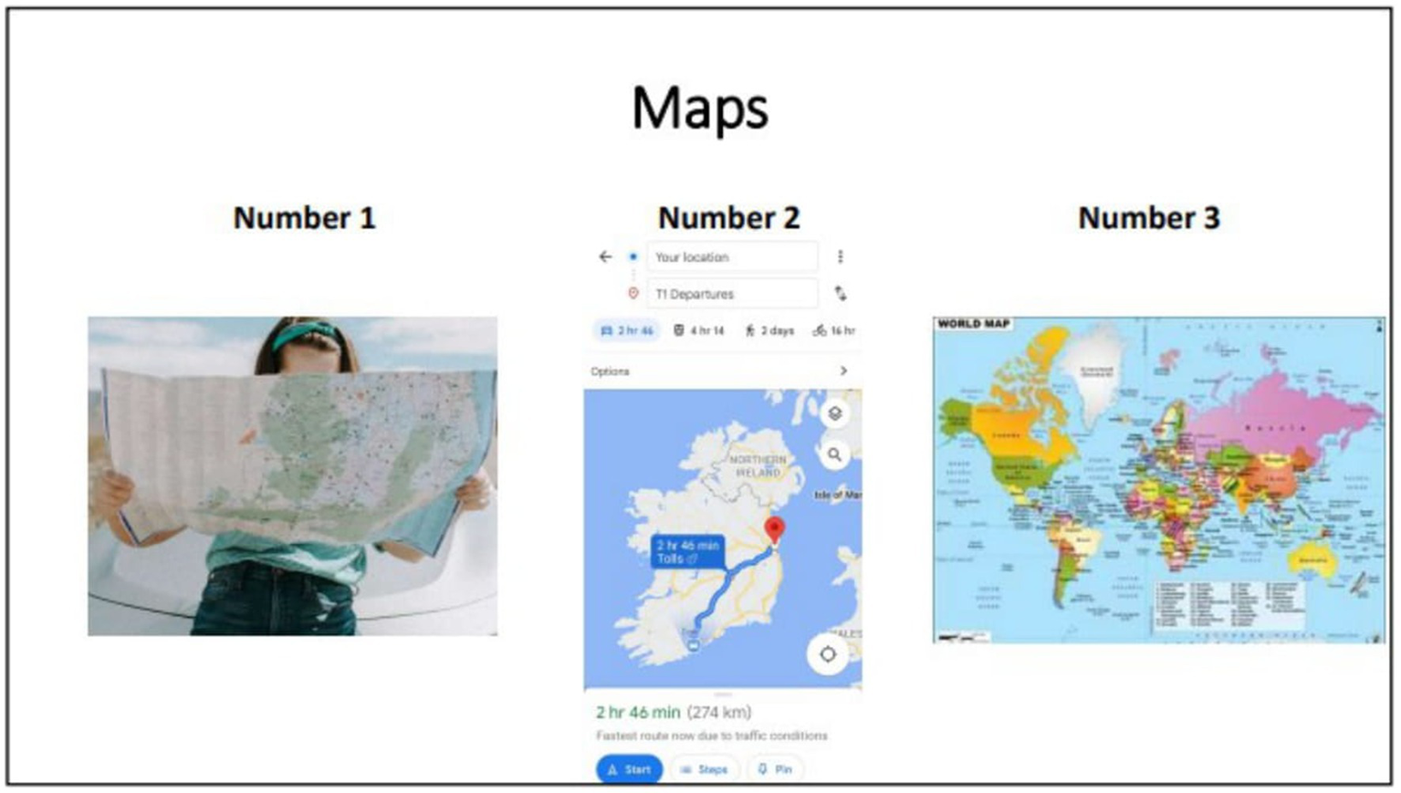 To establish face and content validity the MRM was then shared in electronic and hard copy formats with the 10 collaborators who were completing their adult education course in person (a sub-group of the original 46). Those who attended the online adult education classes were not included at this stage as they had completed the classes and moved on to other things. The process of obtaining feedback was iterative. The third author sent the checklist to the class teacher and asked him to get the participants’ views on the MRM. An in-class discussion took place and the teacher reported back verbally to say that the collaborators liked all aspects of the MRM. We reflected on this process and realized that a request for general feedback was not an adequate method to generate feedback on specific elements of the tool. Consequently, we revised our methodology. Regarding the main section of the MRM (the list of items), we identified 15 image supports from the checklist which we deemed to be either (a) visually unclear, (b) potentially problematic for someone with visual difficulties, or (c) a poor representation of the concept the image was intended to represent. Additional images were sourced for each of these 15 items, to ascertain which image depicted the concept most clearly. These images formed the basis of a PowerPoint presentation that was given to the 10 participants with Down syndrome through the online conferencing platform Zoom. The online conference call was conducted by 3 members of the research team and in addition to the collaborators with Down syndrome, was attended by the class teacher and two teaching assistants. The class teacher acted as a facilitator for any collaborator who had difficulty understanding any aspect of the process. The PowerPoint presentation was given by the second author and consisted of 15 slides each containing 3 different images to represent the same concept. Figure 2 shows an example with reference to the item Maps. Collaborators were then asked which picture depicted each item most accurately/clearly. Responses were tallied and the image for which the majority of the group voted was chosen to represent each item in the checklist.