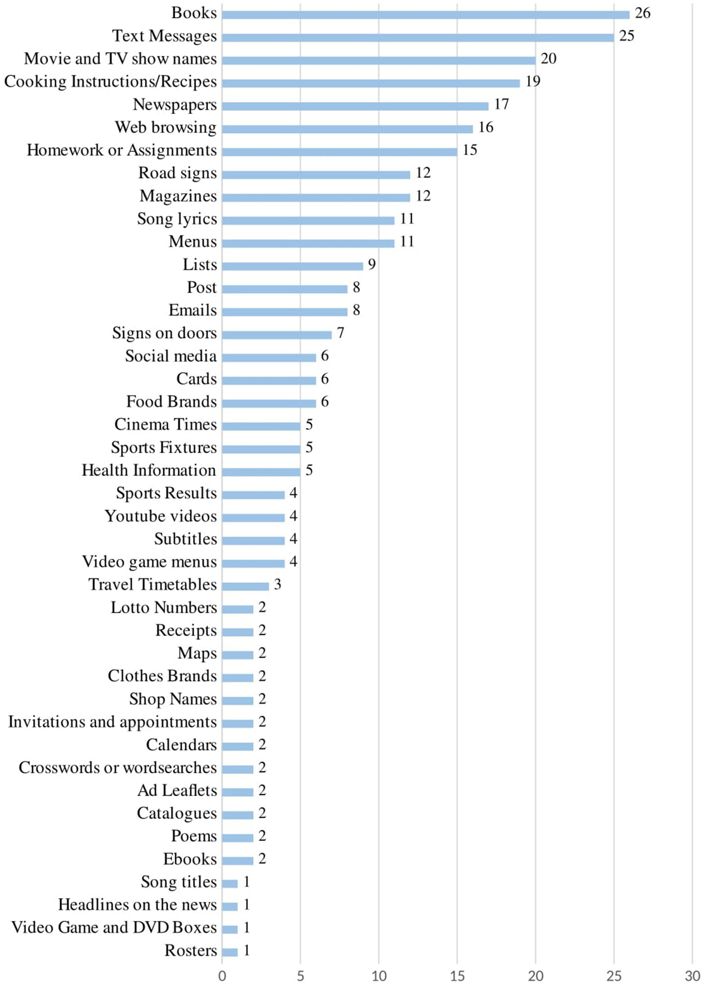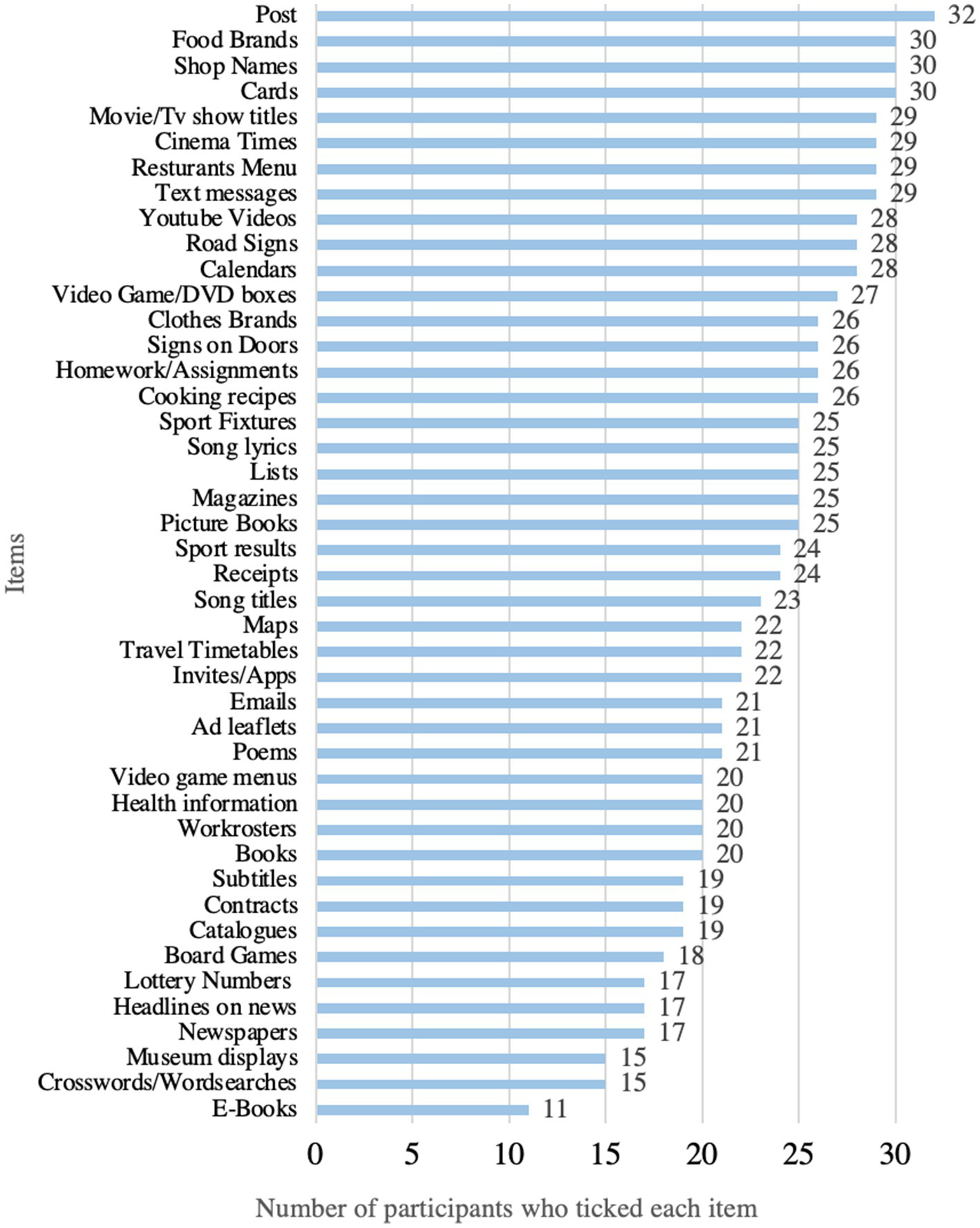 In addressing our first research question we aimed to establish what items should be included in an assessment measure that could be used to profile functional reading in teenagers and adults with Down syndrome and how that measure should be presented (i.e., the ecological, face and content validity of the measure). Responses from 46 collaborators indicated that 42 items should be included in the first version of the checklist. A frequency analysis of the items listed was conducted and is shown in Figure 3. Following a review by the research team an additional 4 items were added—books with picture supports; museum displays; contracts; and board games. This resulted in a total of 46 items in the first version of the MRM.