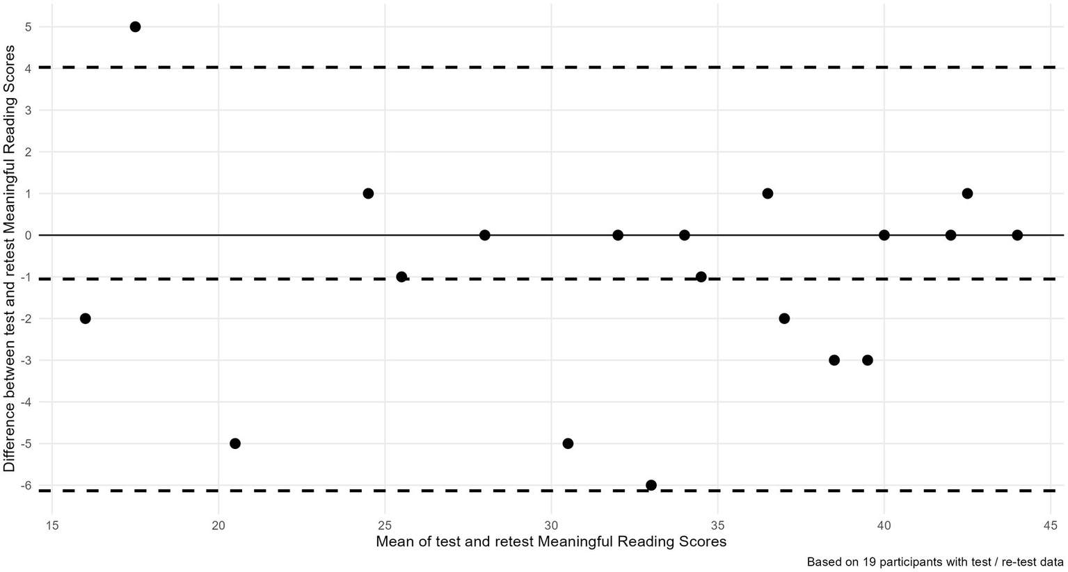 Bland–Altman plot for agreement in test and retest meaningful reading scores.