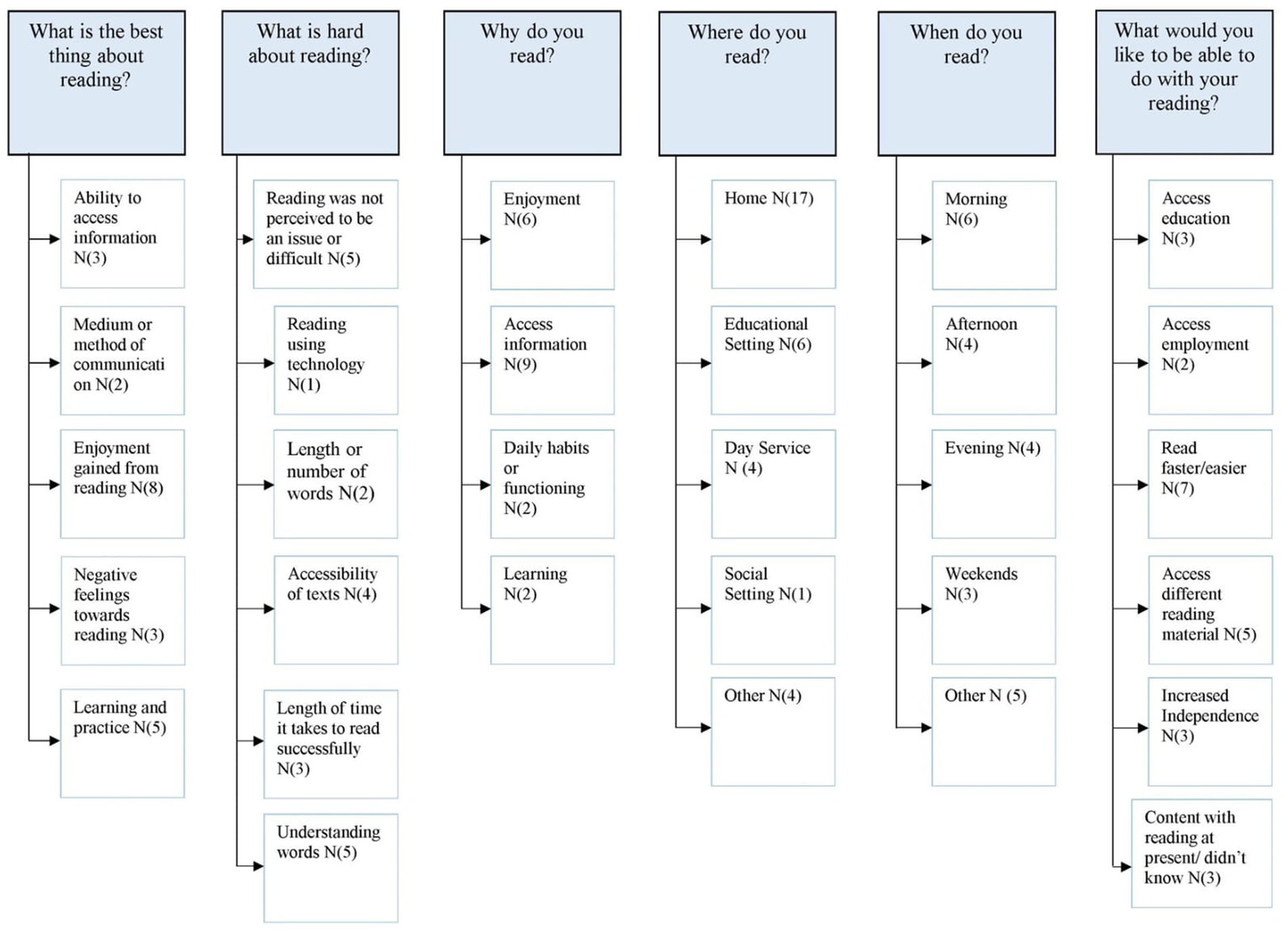 How is meaningful reading experienced by adults and adolescents with Down syndrome in relation to what, when, where and why they read; their preferred medium; what is hard about reading; the best thing about reading; and what they would like to be able to do with their reading?
