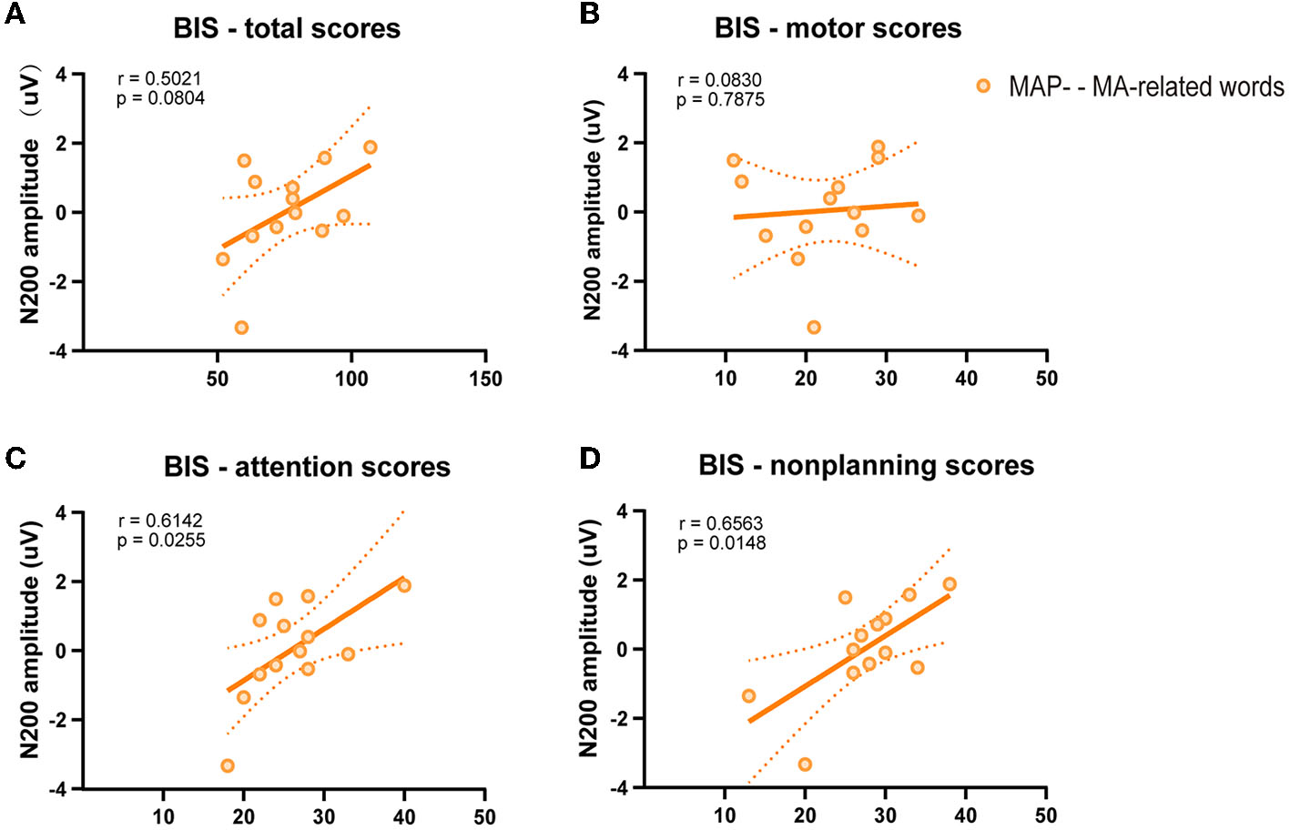 Correlations between ERPs and measured results provided useful information and may further multiply the results of the present research. Pearson's correlation analysis between the Barratt scores and the N200 amplitude was conducted to determine the relationship between subjective traits and N200 amplitude elicited by MA-related cues. A positive association between N200 amplitude and Barratt attentional scores and non-planning scores was observed in MAP- abusers. It may be concluded that those people who scored high in the Barratt attentional score and non-planning score showed a higher N200 amplitude in MA-related word condition.