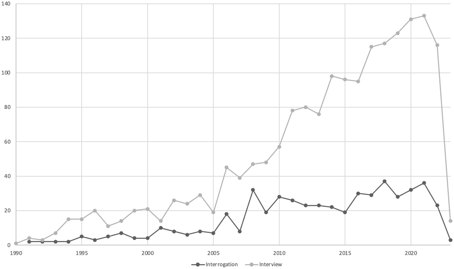 However, because consistency was a concern when creating the corpus of articles for our bibliometric study, we began a trial-and-error process to find the best search query, that is, a search query to automatically limit false positives (included articles that should have been excluded) and false negatives (excluded articles that should have been included), and to avoid having to manually identify articles to include or exclude. For example, unlike the term investigative interview which refers to a very specific concept, and results in few false positives and false negatives, the terms interrogation and interview yields a gargantuan number of false positives. For example, the term interview is widely used in abstracts referring to the qualitative methodology, and the term interrogation is used in a variety of ways unrelated to criminal interrogations and investigative interviews (e.g., “interrogation of diseases,” “interrogation of systems,” “interrogation of nanostructures”).