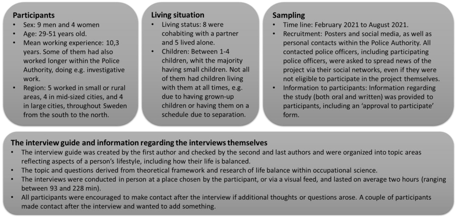 The dataset includes 13 uniformed police officers from Sweden working within different patrol services, for example, focusing on emergency response, road, or community policing duties. These participants are not only police officers but also parents and current or ex-life partners. The dataset is part of a larger dataset aiming to understand police officers’ lifestyles and health. After analyzing the data from 13 participants, the results reached the point of information power (Braun and Clarke, 2022). Consequently, the author group decided no further data needed to be collected.