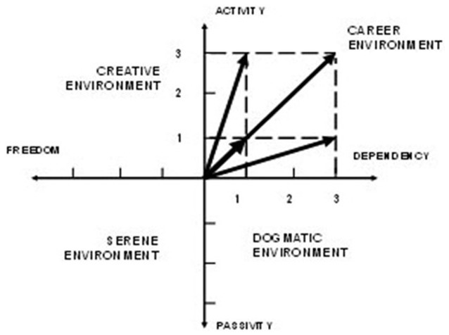 The author proposes four basic types of educational environment: “dogmatic” (contributes to the development of passive behavior and dependence of the child); “career” (contributes to the development of agency and the dependence of the child at the same time); “serene” (promotes the free development, but causes the formation of the child’s passive behavior); “creative” (contributes to the free development of an active child). Based on the answers to the diagnostic questions, corresponding vector, which allows one to assess the learning environment, is constructed in the coordinate system (Figure 1); an example of the possible construction options of a vector model of the environment based on the answer to diagnostic questions). The studies of Yasvin provide a detailed description of the methodology for examining a school educational environment and the typology of educational environments at schools (Yasvin et al., 2015; Yasvin, 2020).