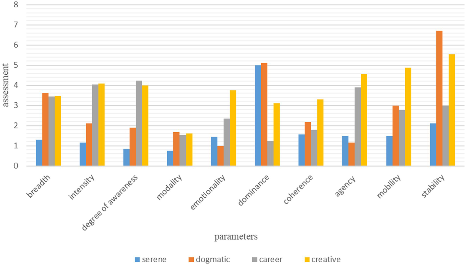 | serene | dogmatic | career | creative | |