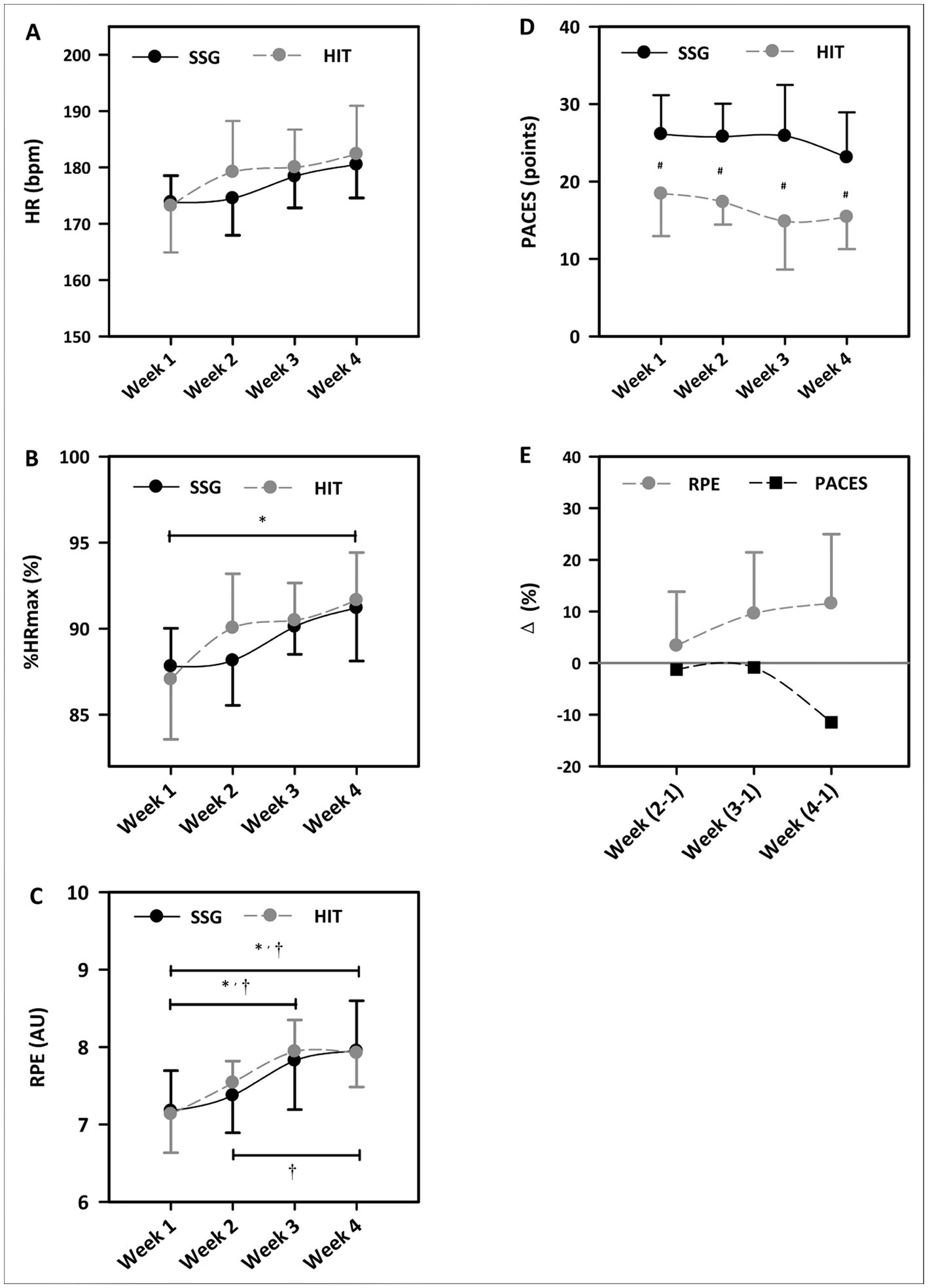 HRmean(A), %HRmax(B), RPE (C), and PACES (D) recorded in the SSG and HIT groups, and %change of RPE and PACES (E) in the SSG group during the 4-week training period. Week (2–1): the PACES or RPE of the SSG group in week 2 minus that in week 1; SSG: small-sided game; HIT: high-intensity interval training; *significant differences within the HIT group; †significant differences within the SSG group; #significant differences between the SSG and HIT groups; error bars for HRmean, %HRmax, RPE, and PACES is standard deviation (SD).