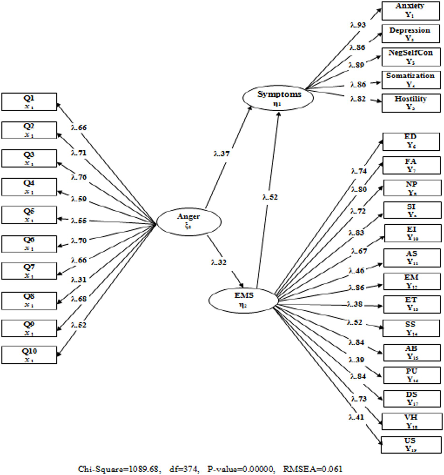 In this study, the impact of EMSs on the prediction of psychological symptoms related to the trait anger variable was examined using a mediating variable. The relationships between trait anger, psychological symptoms, and EMSs were explained using an associational model in which mediating role of EMSs was examined between the exogenous variable of anger and indogenous variable of psychological symptoms. This is a descriptive study, as it was conducted by gathering evidence about the validity of the model established (Fraenkel and Wallen, 2009).