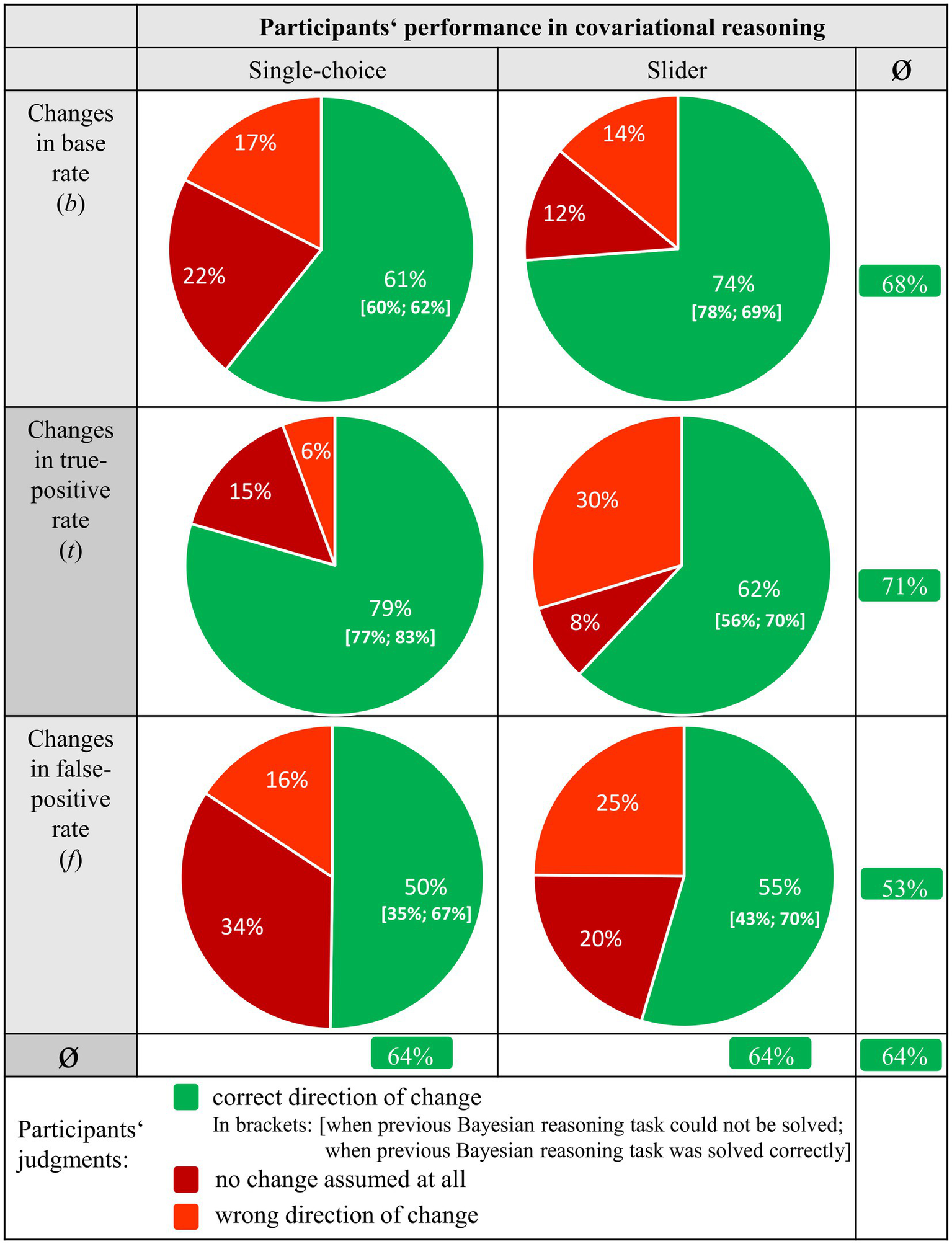 Interestingly, it is no straightforward task to measure the covariational reasoning of participants. In contrast to Bayesian calculation tasks—where one can just ask for a certain conditional probability (given three other probabilities)—how to operationalize such a task is an open question. Why is measuring covariational reasoning so difficult? If you just change one of the given probabilities (e.g., by a certain percentage), you get nothing more than a new conventional Bayesian reasoning task. For this purpose, we used the single-choice operationalization presented by Böcherer-Linder et al. (2017) for measuring covariational reasoning in Bayesian situations and added a second operationalization with a slider.