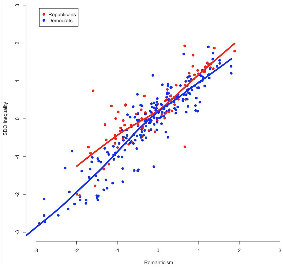 Question 4: What is the functional form of the relationship between romanticism and anti-democratic attitudes and is it consistent across political identities?