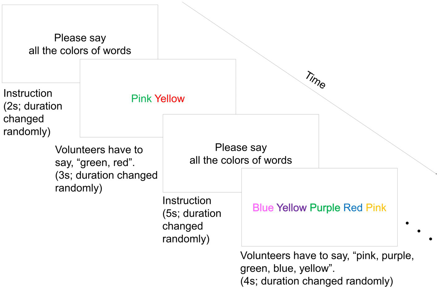 An image of the Stroop Color-Word Test. Colored words were shown simultaneously, and volunteers had to say all the colors of words on the screen before changing the slide. A maximum of seven color words were displayed on the monitor. The seven color words were blue, yellow, green, pink, purple, red, and light blue. The number of color words displayed on one slide randomly changed from 1–7. The slide was displayed automatically and switched to the next slide at random intervals of 1–8 s. The interval between stimuli was randomly 1–6 s by inserting instruction slides between word slides. A total of 100 slides were presented as stimuli.