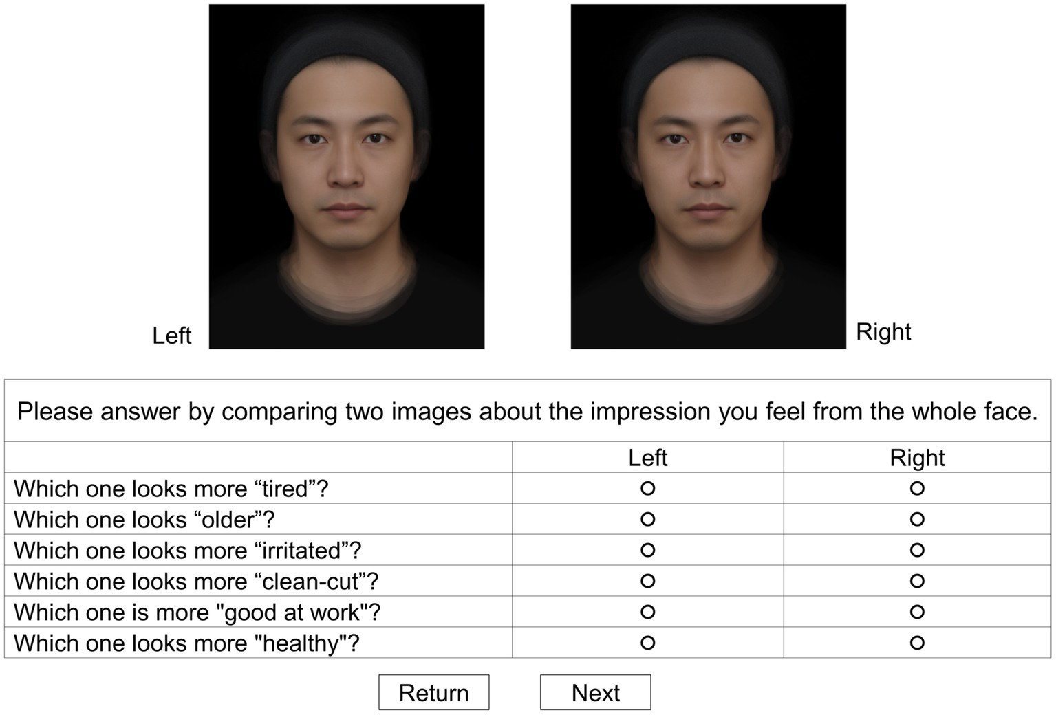 The survey was conducted by Marketing Center Co., Ltd. using a platform named Market Observer (GMO Research Co., Ltd.). It is a system in which responses can be made on a browser, regardless of the type. The participants looked at the stimuli on their personal computers or tablets and completed the questionnaire at home. At the beginning of the questionnaire, the participants were requested to select the terminal that they were using to respond to the questionnaire. Participants who chose anything other than a desktop, laptop, or tablet were excluded from the survey. Facial images were evaluated in paired comparisons. Two facial images were displayed on the left and right sides of the monitor, and six questions were presented below the facial images. We set six items related to the facial impression (“looks tired,” “looks old,” “looks irritated,” “looks clean-cut,” “looks good at work,” and “looks healthy”). Decreased blood flow due to stress can cause changes in skin color (Watanabe and Kageyama, 2017). In our hypothesis, we expected the change in skin color’s brightness to be related to the impression of “tired” and “old” and change in redness to be related to the impression of “irritated.” It is known that the brightness under the eyes affects the appearance of “health” (Jones et al., 2016). Dark circles have also been reported to be a sign of fatigue (Sundelin et al., 2013). Based on these findings, it was perceived that darker skin might provide the impression of being tired. Redness of the skin is also known to result in an impression of “aggression” (Stephen et al., 2012). Therefore, we adopted “irritated” as an impression word related to “aggression.” Furthermore, it has been reported that the age of a man can be predicted by skin color (Fink et al., 2012). Hence, we selected the term “old.” In addition to these negative questions, we added the same number of positive questions (“looks clean-cut,” “looks good at work,” and “looks healthy”). Positive questions were used to ensure that participants had carefully reviewed and responded. We assumed that if participants all chose the left or right image, there would be discrepancies in the selection rates of the positive and negative questions. Participants compared the two facial images and responded with which facial image was more suitable for the items. They repeated this for three pattern combinations (“baseline” vs. “0H,” “baseline” vs. “1H,” and “baseline” vs. “3H”). The images and questions were switched at the participant’s own pace, and they responded to each combination pattern once. The display position and appearance order of the images were randomized. The order of questions was also randomized for each participant and presented in the same order when the presented images were switched. Figure 4 shows an image of the survey screen.