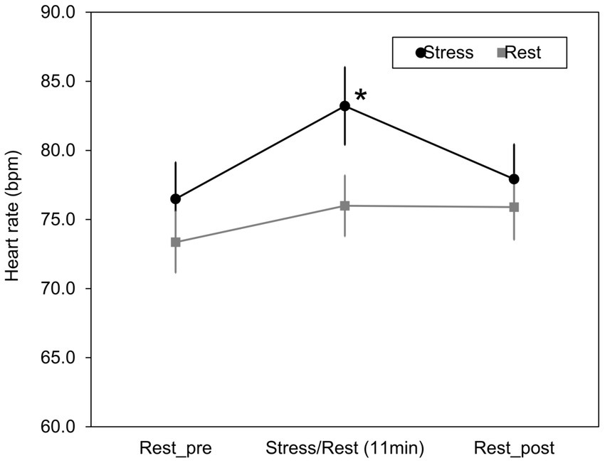 When psychological stress is experienced, and the sympathetic nervous system becomes dominant, the heart rate increases (Skoluda et al., 2015). We measured heart rate, with a wearable heart rate sensor (myBeat WHS-1; Union Tool Co., Tokyo, Japan), as an index of the psychological stress load. It calculated the heart rate every 30 s through an electrocardiogram, measured by placing two electrodes on the left side of the chest. The participants’ heart rates were measured during the Stroop test or rest condition (11 min) and when relaxed (2 min) before and after the two conditions. The participants were seated at rest for 2 minutes before and after the stress or rest conditions.