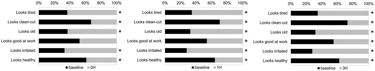 The results showed that the rate of participants who chose “baseline” was significantly lower in the items “looks tired,” “looks old,” and “looks irritated” and higher in “looks clean-cut” and “looks healthy” compared to other images created from photographs after the stress task (“0H,” “1H,” and “3H”).