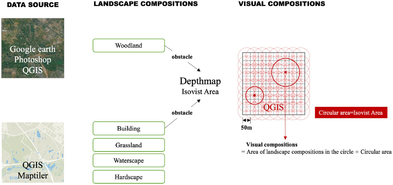 Given that the study was largely concerned with perception, visual landscape compositions were measured both in terms of the actual landscape distributions and what people can visually perceive within the site using QGIS and space syntax. The buildings and woodlands were set as visual obstacles, the boundaries of which were identified using QGIS Maptiler and Google satellite images to delimit the visible area. Space syntax software Depthmap was used to analyze the spatial visibility of the site over a 50 m × 50 m grid so that the visible area of each unit could be obtained. These were then imported into QGIS to generate the corresponding vector circles. The area of grasslands (G), waterscapes (Wa), hardscapes (H) and woodlands (Wo) within each circle were calculated to indicate what landscape compositions of Jiangjia Art Garden people visually perceived (Figure 2).