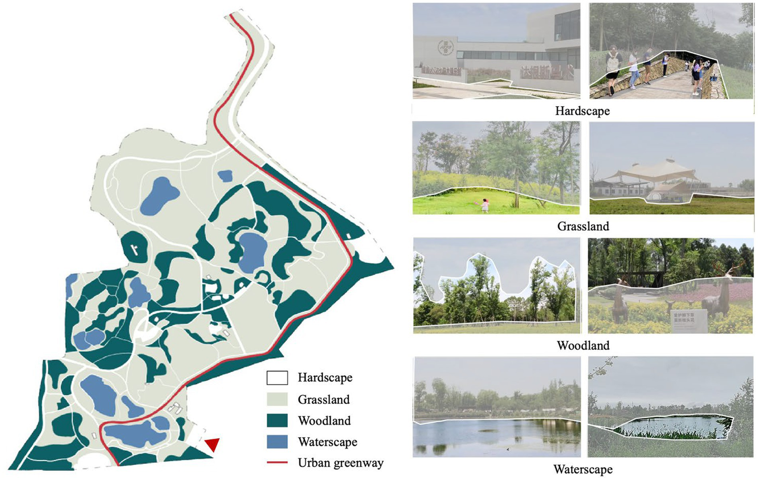 The actual landscape distribution of Jiangjia Art Garden indicates that the site is largely dominated by natural attributes such as grassland, woodland, and waterscape. Grasslands (51.9%) are the dominant feature, followed by woodlands (23.7%) and waterscape (6.7%), while hardscape such as pathways, squares, and playgrounds comprise around 17.7% of the total acreage. Grasslands are evenly distributed within the site, while woodlands are mainly centered along the main pathway and greenway. Waterscape is present mostly in the form of artificial lakes. The largest lake, which is composed of four pieces, was designed enclose to the main entrance of the site in a node-like fashion. One medium-sized and two small-scale lakes are located in the northeast and west of the site, respectively, and are set together with dense woodland. Another medium-sized lake is in the middle of a large-scale grassland at the northwest of the site. There are three nodes characterized by hardscape including one at the entrance functioning as a tourist transportation center, one in the middle that constitutes a landscape node surrounded by woodlands and lakes, and another one mainly composed of recreation facilities (Figure 3).