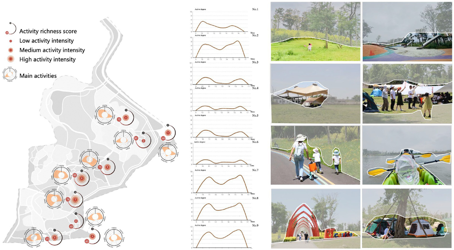 The results indicated that nature-dominated visual landscapes such as grassland, waterscapes, and woodlands, as well as natural sounds such as bird sounds, chirp sounds, and wind sounds were found to be positively correlated to the vitality of activities and people’s emotional status. Regarding behavioral responses, it was shown that grasslands and woodlands are more likely to be attractive places for recreation, and the vitality measured became extremely high when these two were paired with lakes. As for the emotional responses, people’s perceived overall satisfaction, calm, and agreeableness were equally reflected in their behavioral patterns, suggesting a strong relationship with natural factors.