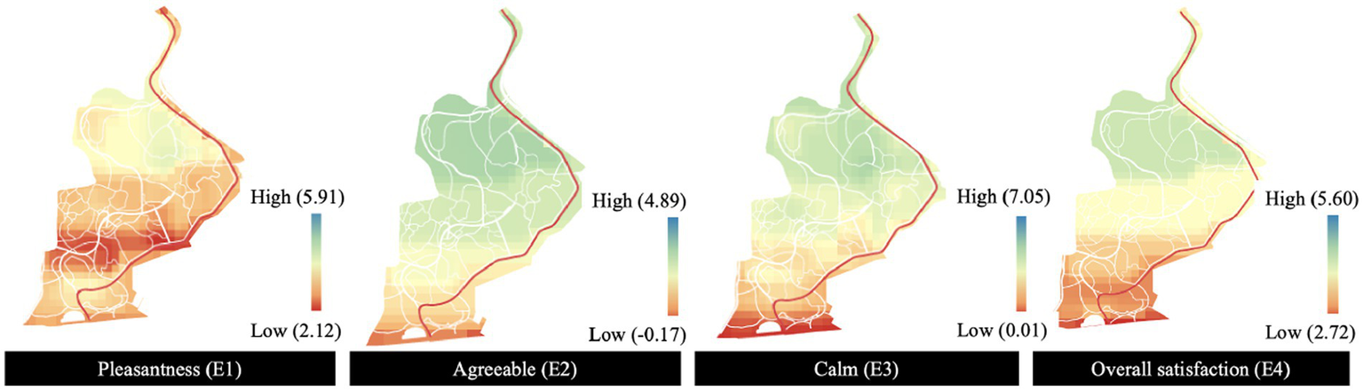 The analysis methods for exploring the relationship between human emotions and environmental aural-visual qualities normally conducted in two ways. The first one is to investigate the influencing factors of people’s positive or negative emotions through correlation analysis (Kong et al., 2022). However, it is only suitable for revealing the influence of a certain or a few of certain dimensions without presenting their interactions. Another way is to build a linear regression model to predict the overall environmental satisfaction or people’s emotional responses based on environmental aural-visual qualities. It can easily describe the complex relations existed between multi-dimensional environmental quality (Shao et al., 2022), but with an obvious disadvantage: the modeling method can be difficult to comprehend in design practices. Thus, this study decided to use the modeling method together with the mapping method, so that the relationship between environmental visual-aural qualities and human emotional and behavior responses can be directly presented.