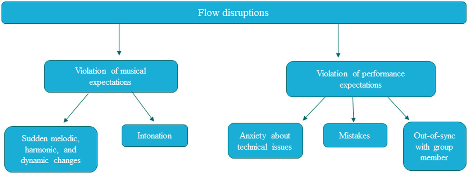 Participants reported several factors that disrupt flow: (1) Sudden melodic, harmonic, and dynamic changes, (2) intonation/frequency abnormalities, (3) anxiety about physical or technical aspects of performance, (4) mistakes, and (5) feeling out-of-sync with group members. Figure 2 shows the different themes identified in the data. The left column again shows that these themes fell into two categories: (1) Violation of musical expectations (melodic/harmonic/timbre/dynamic changes in the music), and (2) Violation of performance expectations (intonation issues and feeling out-of-sync with group members, mistakes, and anxiety). Each of these themes will be discussed in relation to the current literature. See Supplementary material for thematic analysis.