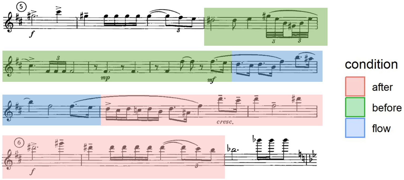 A recent review found that studies on flow in musical performance primarily have used self-report methods to investigate the psychological conditions of flow (Tan and Sin, 2021). However, the performance paradigms used to induce flow vary greatly. For example, in Fullagar et al.’s (2013) study, participants were asked about their flow during an examination. This led to the authors finding that flow is linked to performance anxiety. However, flow has also been found to be linked to improved performance and effortlessness (de Manzano et al., 2010). This study instead had musicians bring a piece into a non-evaluative lab context and play it multiple times. The striking difference in methodology in the field has led to mixed conclusions about the psychological nature of flow. Another point of interest about the performance literature is the bias towards dispositional flow, rather than state flow (Chirico et al., 2015). Dispositional flow refers to enduring characteristics that make flow more likely to occur, such as having an autotelic personality (Nakamura and Csikszentmihalyi, 2005). State flow, on the other hand, involves real-time external contexts and characteristics that foster flow (e.g., Bakker, 2005). Dispositional flow measures individual differences, from a psychological perspective, though it is less well equipped than state flow to understand external musical factors which may also be contributing to inducement of the flow state. These non-standardized performance paradigms and partiality to dispositional self-report methodologies not only approach flow from a solely psychological lens, but also leave ambiguity in terms of parsing the mechanisms behind musical performance flow. This in turn motivates the present approach of studying the mechanisms underlying flow from a musical analysis perspective.