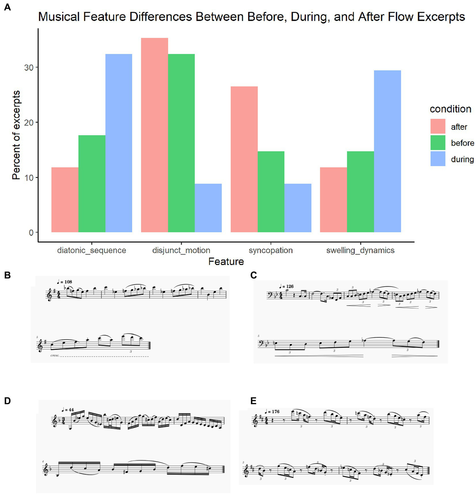 (A) Musical feature differences between before, during, and after flow excerpts; (B) Repeated sequence during flow, excerpt from Sonatine pour Flûte et Piano by Claude Arrieu; (C) Swelling dynamics during flow, excerpt from Concertino for Trombone by Ferdinand David; (D) Disjunct motion after flow, excerpt from Concertino for Flugelhorn and Piano, mvt 2 by William Himes; (E) Syncopated rhythms after flow, excerpt from Recorda Me by Joe Henderson.