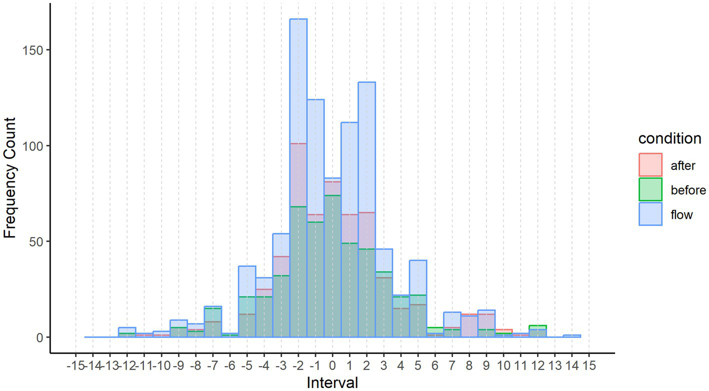 One of the most straightforward ways to examine melodies is by looking at the distribution of pitch intervals (the sequence of two adjacent notes in a melody), which summarizes the frequencies of interval categories in a given set of melodies (Vos and Troost, 1989; Thompson, 2013). Thus, we examined the distribution of pitch intervals in three conditions: the measures that participants indicated being lost in the moment (flow condition), the 4 measures preceding the flow condition (before condition), and the 4 measures following the flow condition (after condition) formed each of 3 conditions for within-excerpt comparison (see Figure 3 for an example). These conditions were each transcribed as score files from the participant-submitted scores through MuseScore 3.6.2, after which they were exported into midi files. The midi files were converted into.csv files using the Python library py_midicsv (Wedde, 2023).