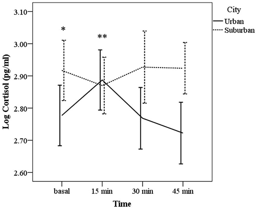 Mean (± CI 95%) of salivary cortisol levels (log transformed) before (basal), 15, 30, and 45 min after the exposure of images with violent content in people living in urban and suburban cities. Urban city ** p < 0.01, 15 min vs. 45 min; * p < 0.05, Suburban vs. Urban city.