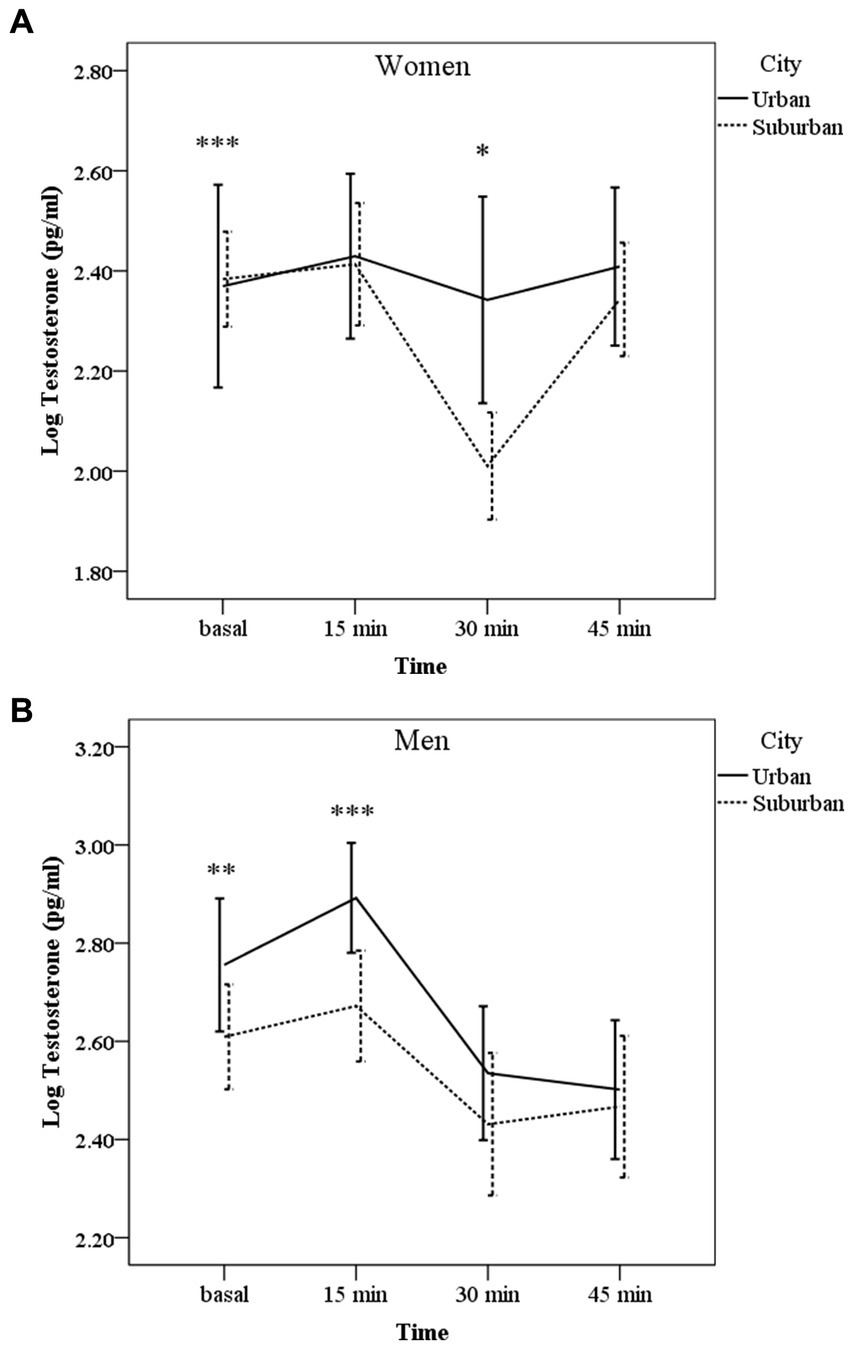 Figure 2A indicates no statistically significant testosterone changes over time in women from the urban city, whereas in suburban women testosterone decreased 30 min after the images compared to basal sample (p < 0.001) and compared to urban women at the same time (p = 0.01). AUCG for testosterone did not differ between cities (F = 3.17, p = 0.07).