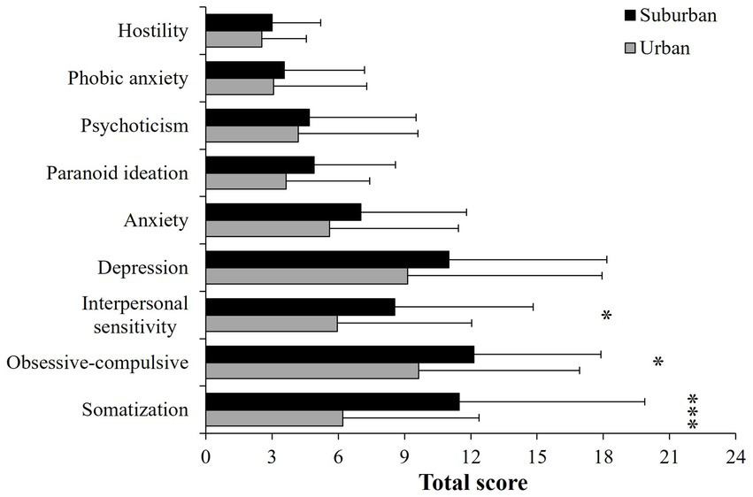 Mean (± SD) of the checklist symptoms (nine dimensions) of participants living in urban or suburban cities. ***p < 0.001; *p < 0.05.