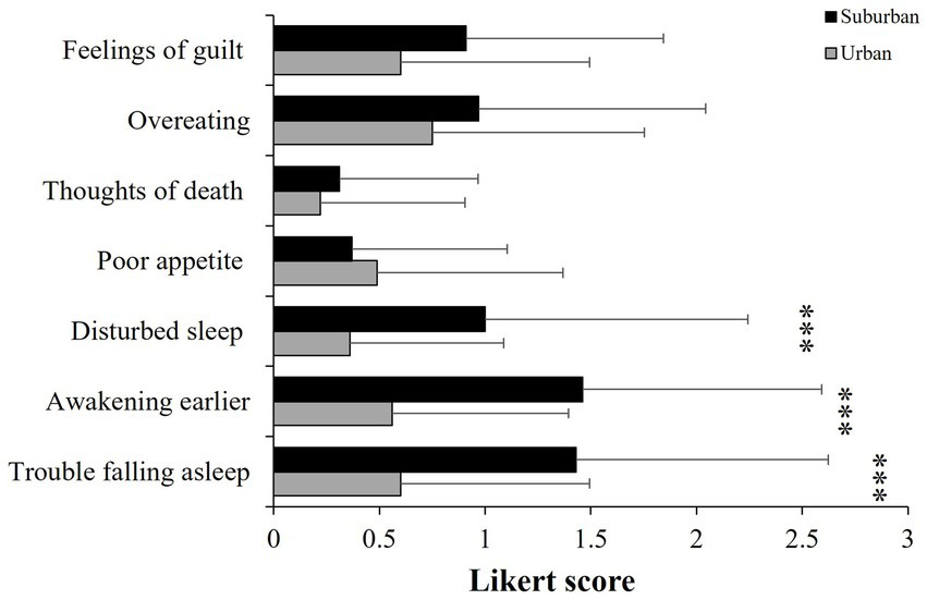 Mean (± SD) of the checklist symptoms (seven items) of participants living in urban or suburban cities. ***p < 0.001.